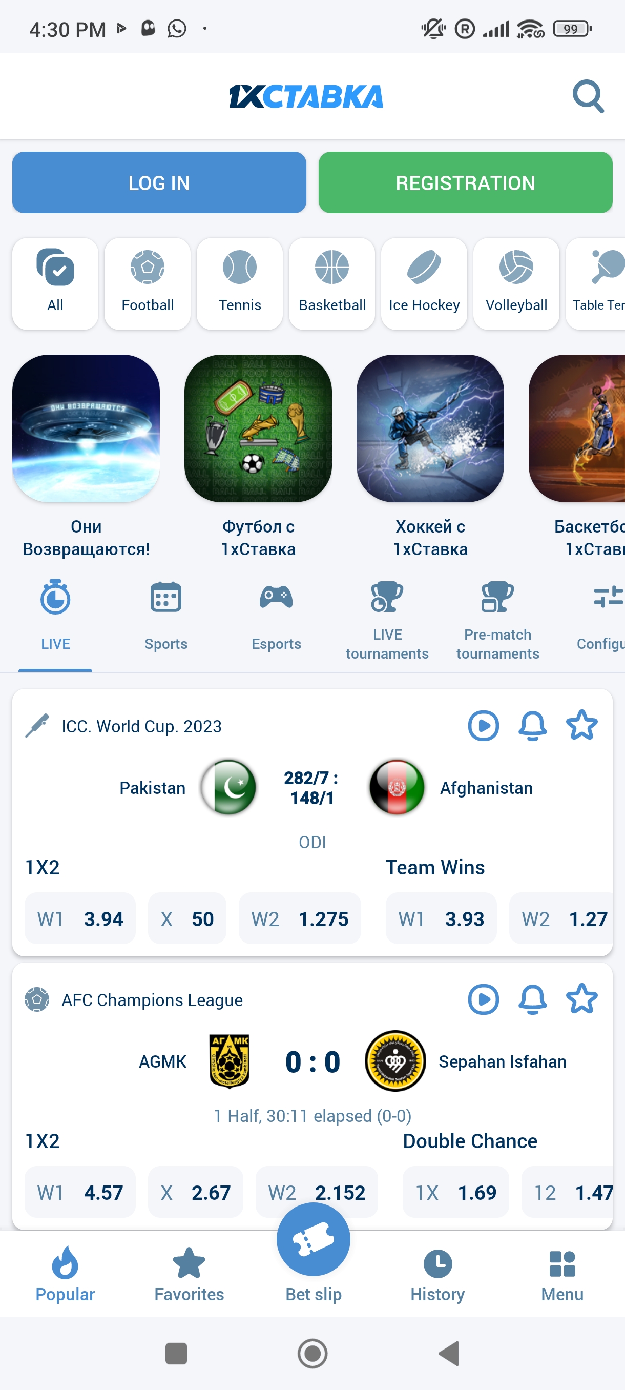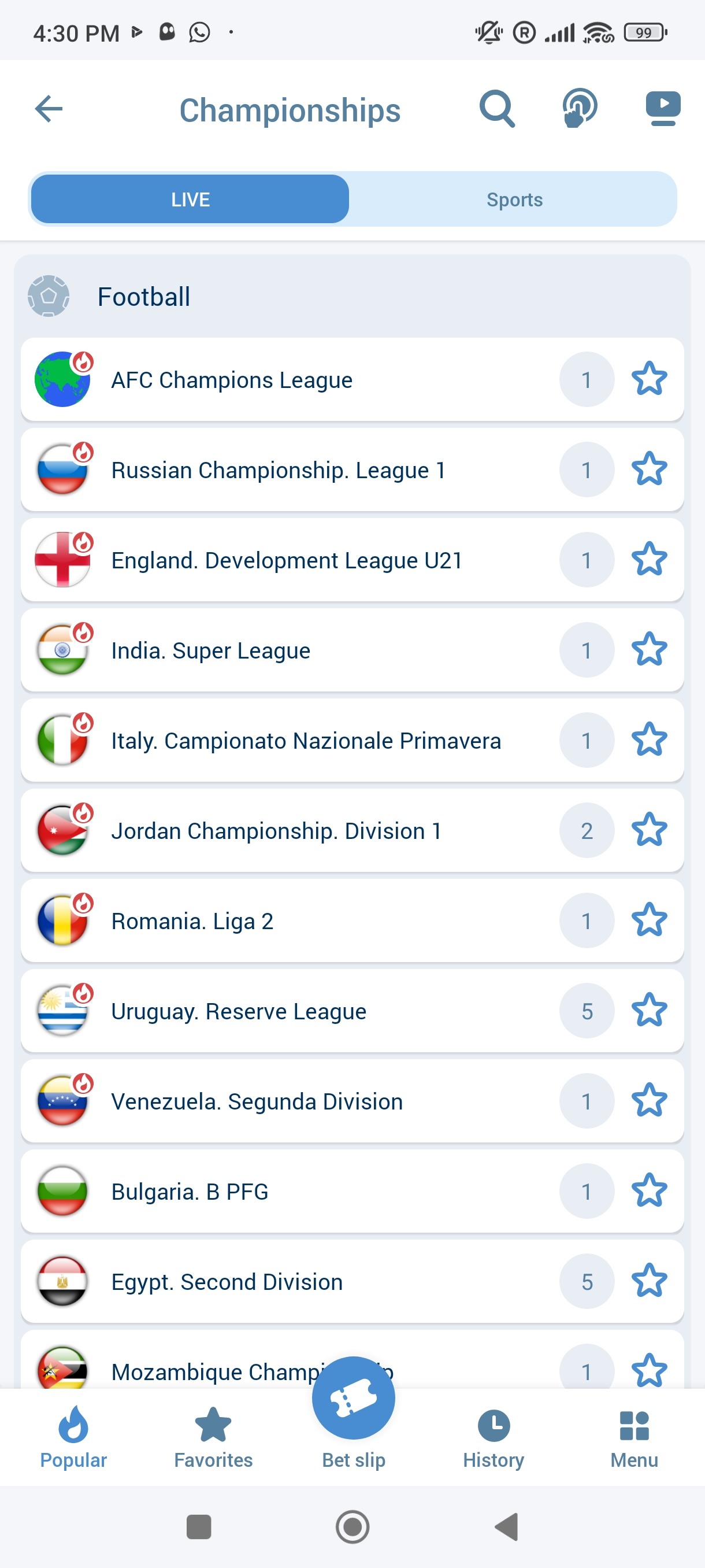 The matches on which the user can place bets are available on the main screen of the application and are divided into two blocks: