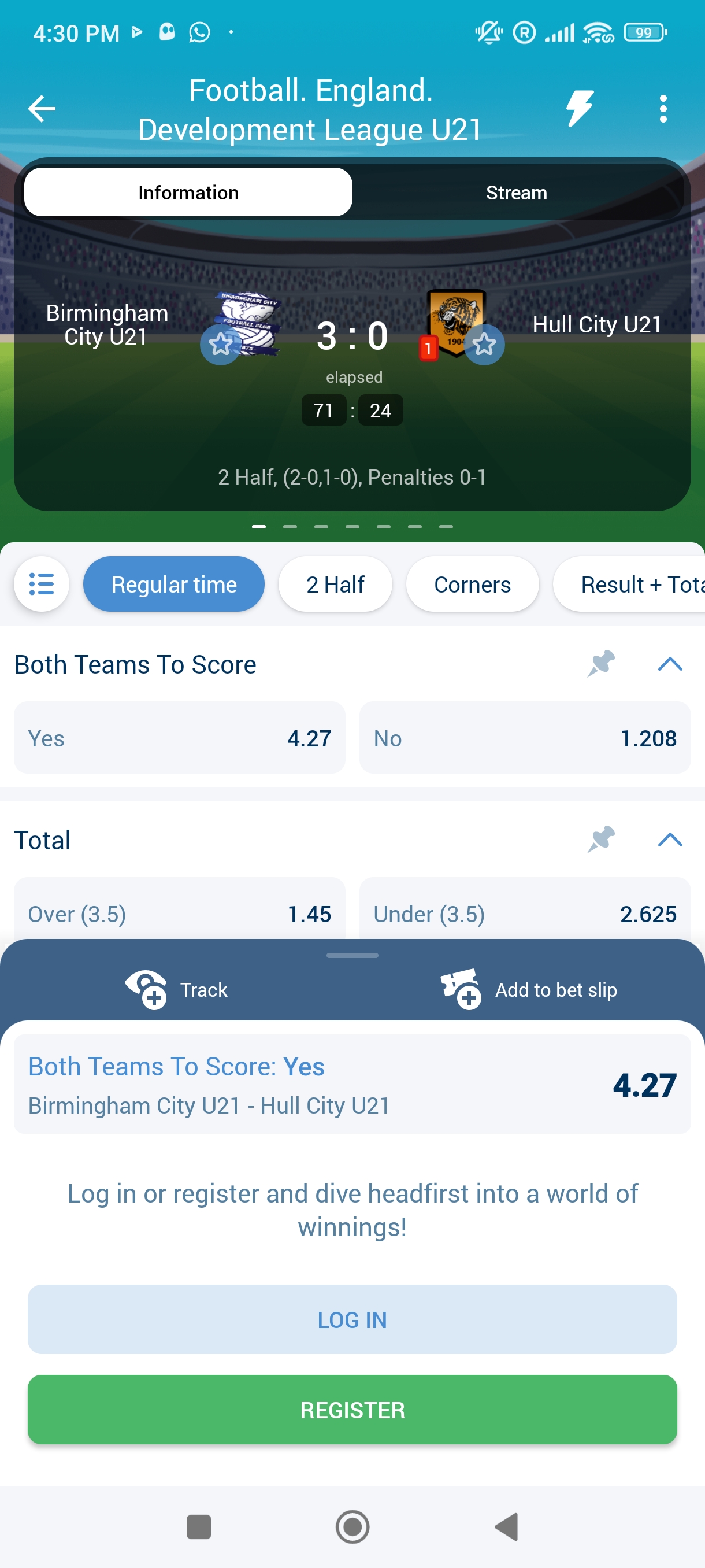 - Go into the selected match, its details open up, find the outcome you want to bet on and click on its odds.