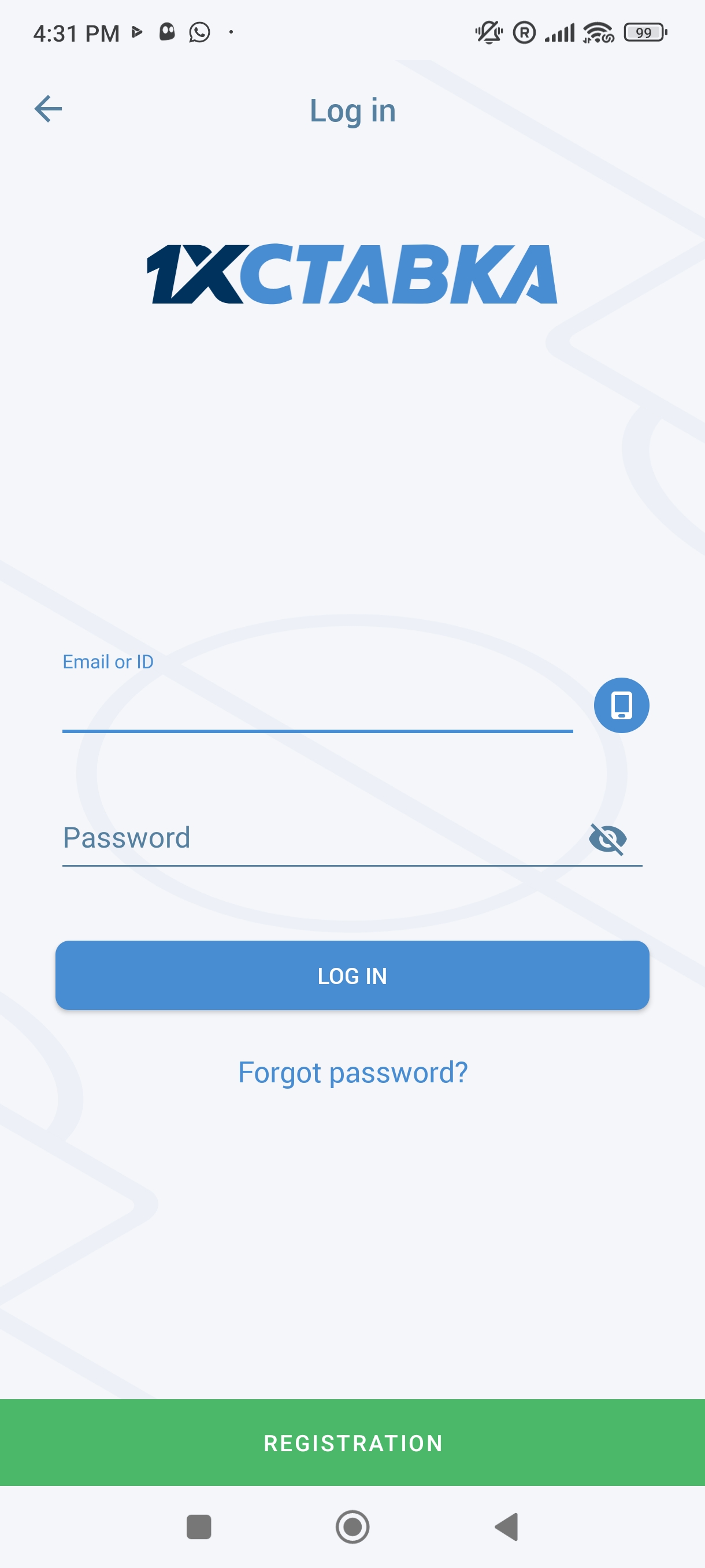 - Log in to the personal account in the 1xBet mobile app by specifying the login (phone number or email) and password.
