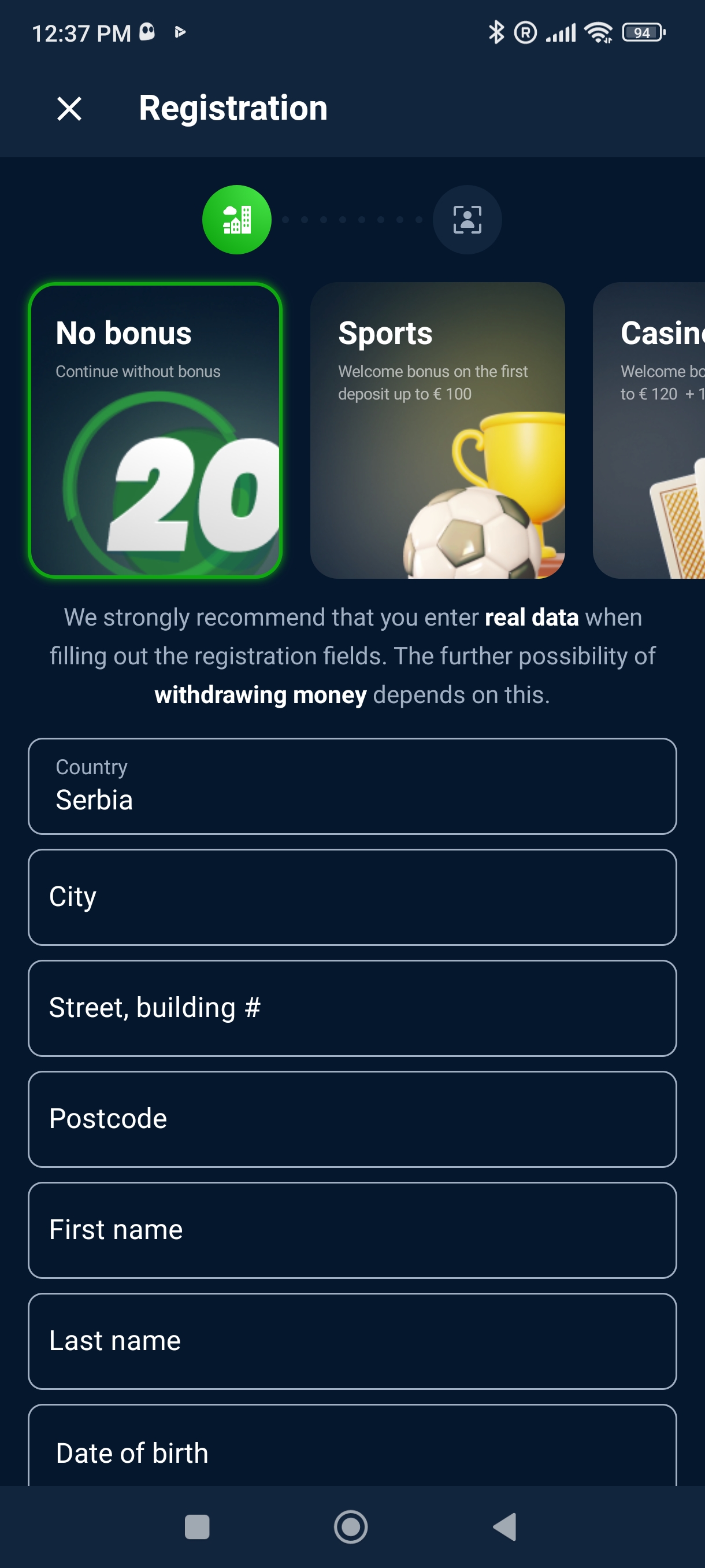 To start, the bettor needs to go through personal registration, specify a name, age, mobile phone number or email address, preferred account currency, and enter a captcha. After that, you need to follow the link contained in the letter sent to the specified email address. Then the user accepts the terms of the user agreement and sets a personal password to enter the personal account