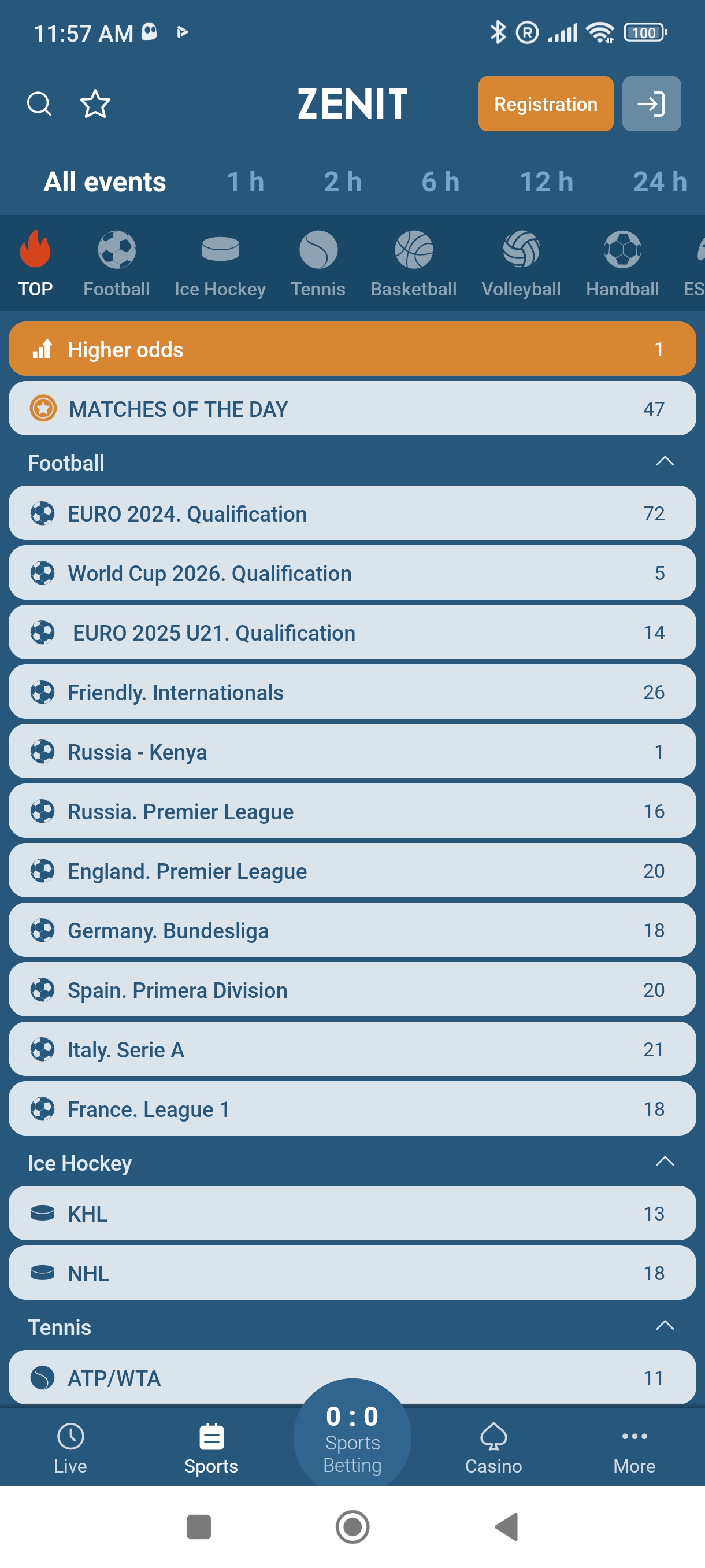 The Zenit betting app offers wagers on more than 40 traditional sports, as well as esports. Navigating the sportsbook is straightforward. At the top of the list are the most popular sports among bettors, such as football, hockey, tennis, and basketball. The remaining sports are listed alphabetically below.