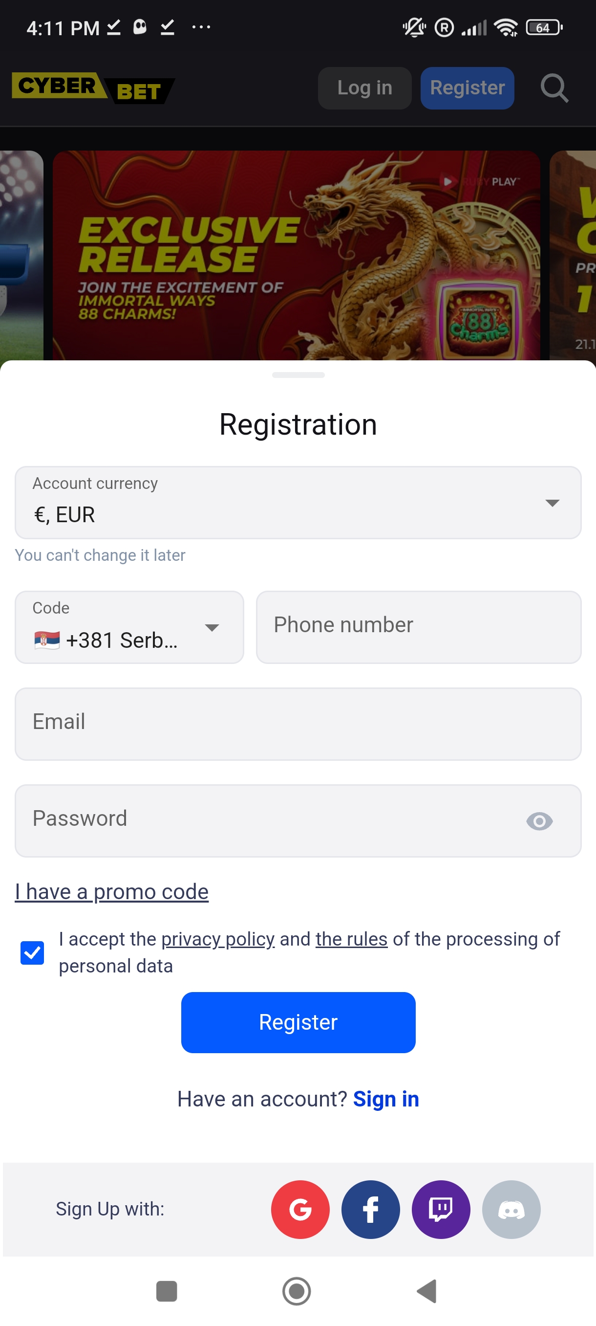 Em primeiro lugar, todos os novos clientes recebem um bônus de boas-vindas Cyber.Bet após o registro da conta. A oferta de registro é apresentada de forma simples: um bônus de 100% no depósito relevante até 300 euros. O valor do bônus pode ser usado para apostar em qualquer tipo de esporte. Antes de aderir a qualquer promoção, certifique-se de ler as regras e condições.