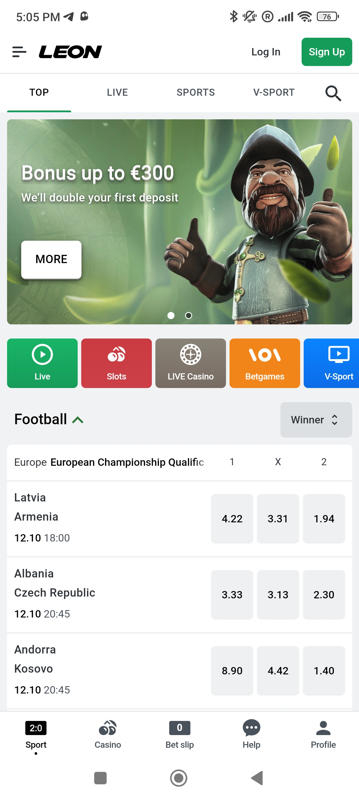 У БК Леон приложение для Андроид весит минимум, скачивание и установка занимают до 12 минут. Затем необходимо запустить софт и протестировать его, ознакомиться с интерфейсом. При выявлении технических ошибок следует переустановить клиент Android.