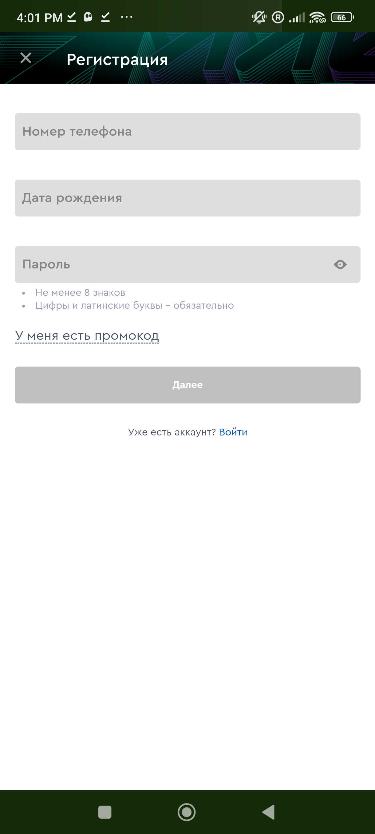 - Заполнить форму, вписав номер мобильного телефона, пароль, промокод, если есть.